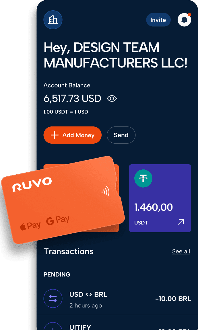 Ruvo connects Pix, crypto, and Visa - so you can receive USD from abroad, convert between BRL and USD, send money to the U.S., spend worldwide, and save in digital dollars with yield.
